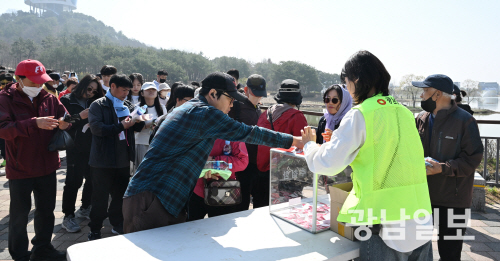 | 추첨함에 경품권 넣고 있는 참가자들 28일 오전 전남 나주시 빛가람 호수공원 일원에서 열린 ‘제22회 영산강 사랑 시·도민 한마음 걷기대회’ 완주자들이 추첨함에 경품권을 넣고 있다. 최기남 기자 bluesky@gwangnam.co.kr |