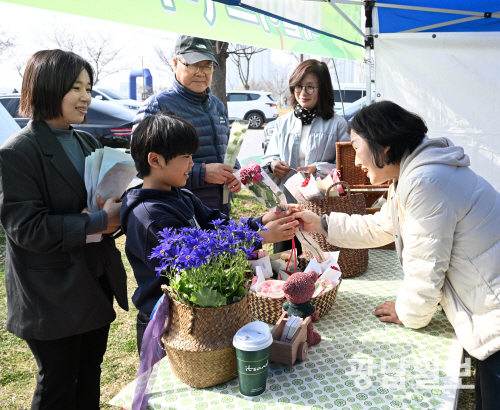28일 오전 전남 나주시 빛가람 호수공원 일원에서 열린 ‘제22영산강 사랑 시·도민 한마음 걷기대회’에 참가자들에게 장미꽃을 나눠주는 꽃집 투웰브바스켓.