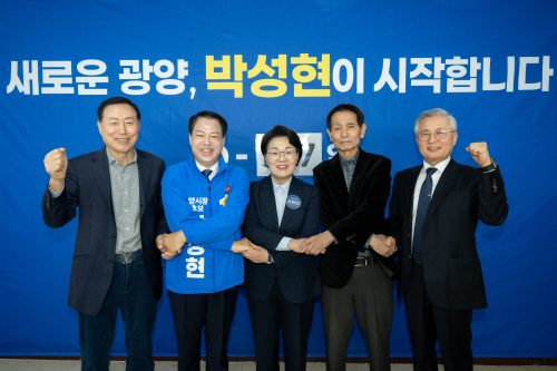 | 박성현 광양시장 예비후보(왼쪽 두 번째)는 지난 28일 선거대책본부에서 권향엽 국회의원과 선거사무소 관계자들이 참석한 가운데 ‘광양 대전환 비전 및 클린선거 선언’ 행사를 개최했다. 사진제공=박성현 광양시장 예비후보 선거사무소 |