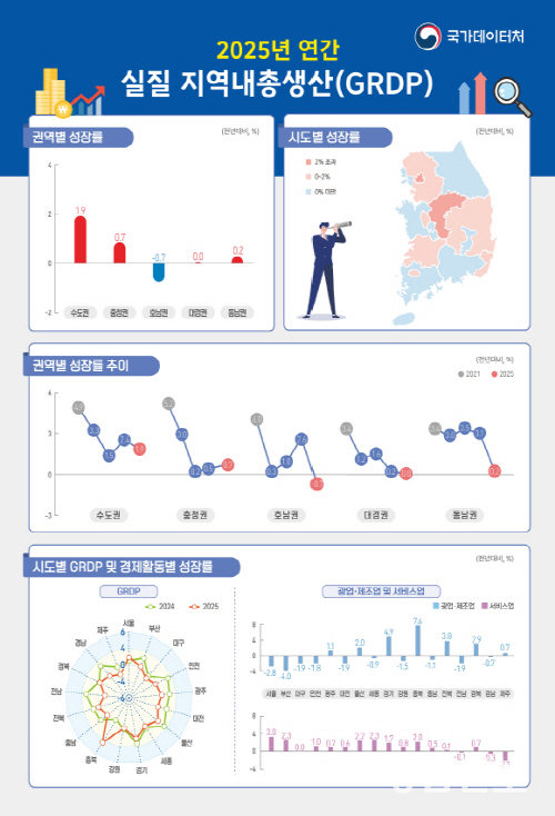 30일 국가데이터처가 발표한 ‘2025년 4분기 및 연간 실질 지역내총생산(GRDP)(잠정)’에 따르면 지난해 호남권 연간 경제 성장률은 -0.7%로 집계됐다.