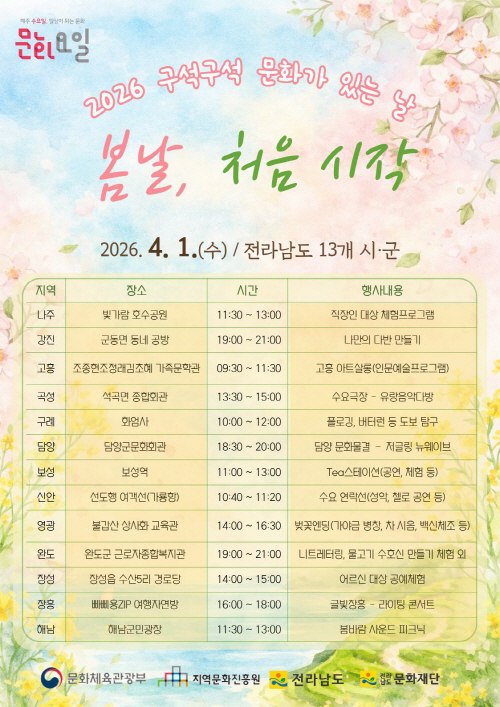 ‘구석구석 문화가 있는 날’은 3년 연속 전국 최대 공모액에 선정(10억 4900만원)돼 이뤄진 사업으로, 지난 2024년부터 전남도민의 문화 향유 기회 확대와 정주 만족도 향상을 위해 진행되고 있다.