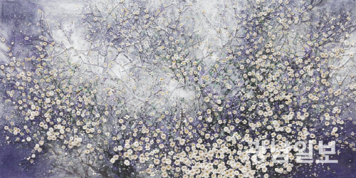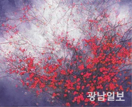 이런 작가가 이번에는 삶의 관록에 한층 더 깊이를 더한 미술적 혜안을 투영한 매화 작품들을 집중적으로 선보일 예정이다. 타이틀인 ‘매화, 피우다’를 보면 작가의 사유의 한 단면을 엿볼 수 있다. 피우다는 사전적으로 얼어나 번지게 하다는 의미다. 여기서는 매화가 피우다는 것을 말하는데, 자연의 섭리가 그대로 녹아있다. 무심코 혹은 문득 바라본 시간 속 다시 매화가 피우는 봄을 통해 모든 세상만물의 이치가 평화와 화해의 시간들을 맞기를 바라는 작가의 마음이 투영돼 있다. 그저 색상으로 볼때 아름다움이 아니라 거칠은 내면을 포근하게 안으면서 갈등이나 분노가 아닌, 평화와 화해의 시간을 갈구하는 작가의 심리적 기저가 작품 속을 관통하고 있다.