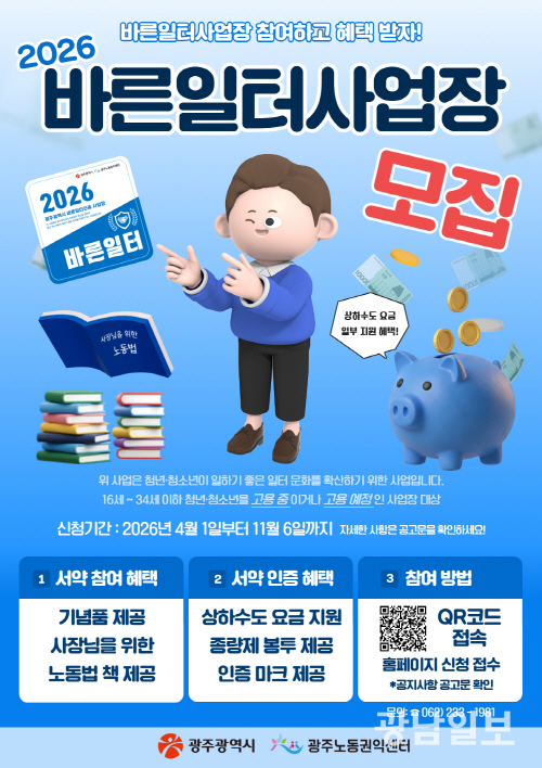 이에 따라 광주시는 노동법 준수와 인권 존중을 실천하는 ‘바른일터’를 적극 발굴·확산해 청소년에게는 안전한 일 경험 환경을 제공하고, 청년에게는 안정적인 노동시장 진입 기반을 마련한다는 방침이다.