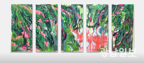 특히 작가의 작품은 짙은 녹색 위로 휘감기듯 지나가는 곡선과 아래로 흘러내리는 물감의 흔적들은 중력의 방향을 가감 없이 드러내며, 정지된 상태에 머물지 않는 움직임을 만들어내는 동시에 붓과 캔버스가 맞닿기 전의 머뭇거림과 이후 이어지는 속도감 있는 운동감이 화면 전체에 배어들며, 변주되는 과정을 보여준다.