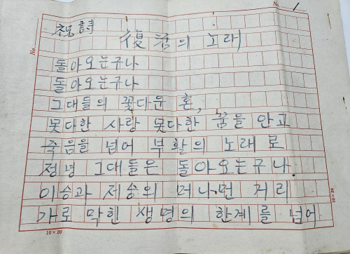 1일 윤상원기념관에 따르면 최근 윤상원 열사의 생가에서 유품을 정리하는 도중 문 시인의 ‘부활의 노래’ 초고가 발견됐다.