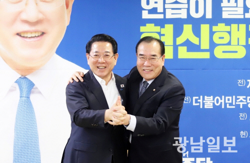 | 이개호 국회의원이 1 일 김영록 민주당 전남광주특별시장 예비후보 사무실을 찾아 김 예비후보와 손을 맞잡고 있다. |
