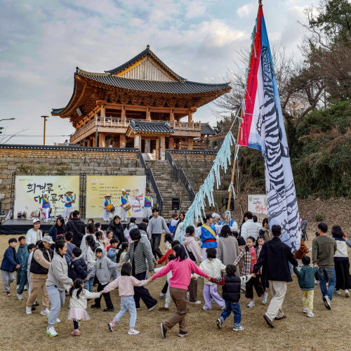 | 광주문화재단은 4일 오후 2시 희경루 일대에서 절기·세시 체험프로그램 ‘2026년 무등풍류뎐 in 희경루’를 갖는다, 사진은 지난달 절기·대보름 행사에서 강강술래를 하는 시민들. 사진제공=광주문화재단 |