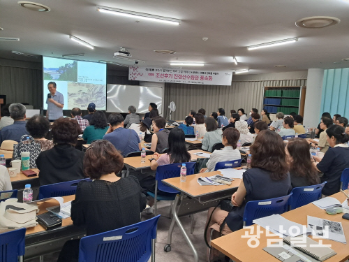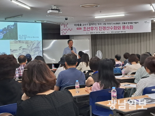 | 광주시립미술관은 ‘2026 미술관 아카데미’를 4월부터 오는 6월까지 총 5회에 걸쳐 세미나실에서 ‘예향의 맥(脈):한국근현대미술 속 광주를 읽다’라는 주제로 진행한다. 사진은 이태호 명지대 석좌교수가 ‘조선후기 진경산수화와 풍속화’라는 명칭으로 미술사를 조명한 2023년 6월 강의 모습. |