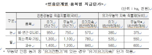 친환경직불제를 5년(5회)을 받은 농가들은 도비 사업인 유기·무농약지속직불제로 친환경농업직불제 단가의 40~50%가 지원된다. 친환경농업직불제는 올해 10월까지 친환경농산물 인증기관의 이행점검을 거쳐 인증이 유효한 것으로 통보받은 농지를 대상으로 12월에 지급할 예정이다.