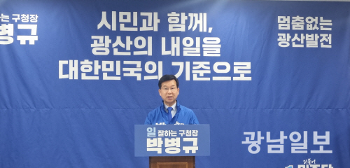 | 더불어민주당 박병규 광주 광산구청장 후보가 6일 광주시의회에서 기자회견을 갖고 일자리·생활밀착형 정책의 지속·발전을 강조하고 있다. |