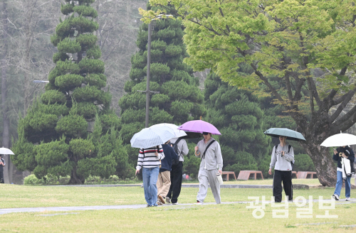 | 봄비 내리는 거리 광주·전남지역에 봄비가 내린 6일 광 주 북구 용봉동 전남대학교 교정에서 우산을 쓴 학생들이 걸어가고 있다.최기남 기자 bluesky@gwangnam.co.kr |