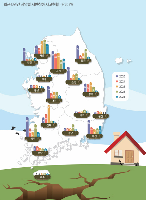 | 최근 5년간(2020~2024년) 지역별 지반침하 사고현황. 사진제공=국토안전관리원 |