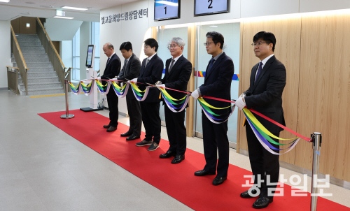 | 광주회생법원은 6일 광주법원종합청사 별관 3층에 ‘빛고을희망드림 상담센터’ 개소식을 진행했다. 개소식에 참석한 김정주 광주회생법원 초대법원장 등이 테이프 커팅을 하고 있다. 사진제공=광주지방법원 |