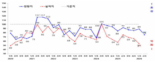 기업 규모별 격차도 뚜렷했다. 대·중견기업은 86에서 150으로 뛰며 호전 전망을 보였지만, 중소기업은 90에서 67로 떨어져 악화 전망이 우세했다. 수출 규모별로도 수출기업은 86에서 64로, 내수기업은 90에서 78로 모두 하락했다. 완성차를 중심으로 한 일부 대기업과 달리, 원자재가와 물류비 부담을 직접 떠안는 중소 협력사들의 체감 경기는 더 빠르게 나빠지고 있다는 분석이다.