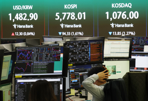 | 9일 코스피는 전 거래일보다 94.33p(1.61%) 내린 5778.01에 장을 마쳤다. 코스닥 지수는 13.85p(1.27%) 내린 1076.00으로 마감했다. 연합뉴스 |