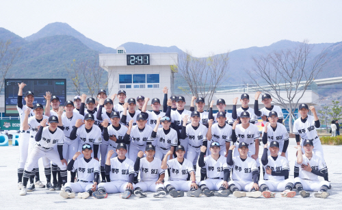 | 광주일고 야구부가 지난 8일 선샤인 밀양스포츠파크 주경기장에서 열린 제물포고와의 대회 8강전에서 8-1로 8회 콜드승을 따냈다. 사진제공=광주일고 야구부 |