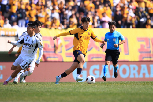 | 지난달 광주월드컵경기장에서 전북현대와의 하나은행 K리그1 2026 3라운드 홈 경기에서 광주FC 유제호가 드리블을 하고 있는 모습. 사진제공=광주FC |