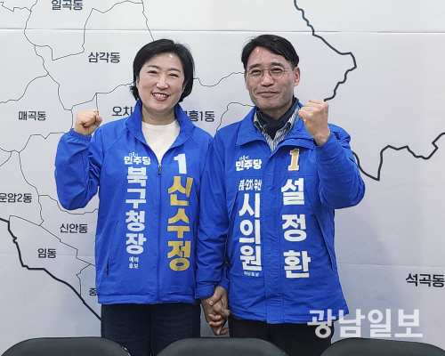 | 더불어민주당 설정환 전남광주통합특별시의원(광주 북구 제2선거구) 예비후보가 9일 신수정 광주 북구청장 예비후보에 대한 지지를 선언했다. |