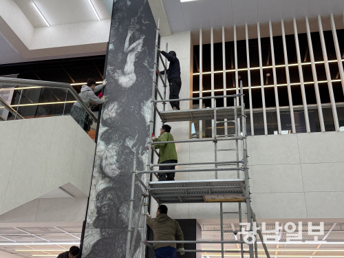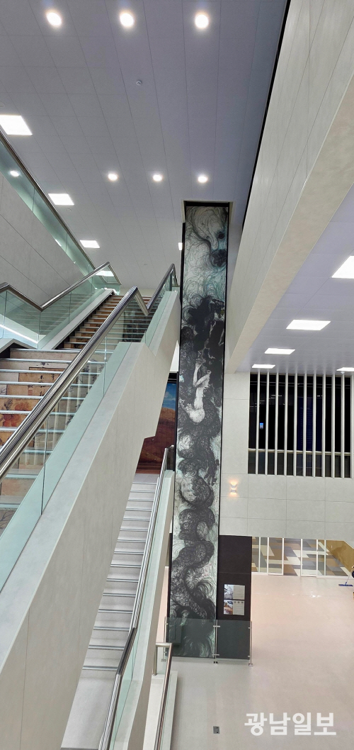 로비에서 보면 1층에서부터 3층까지 뚫린 공간에 세로로 새롭게 설치됐다. 특히 부적합한 공간 벽이나 사선 등이 아닌 세로로 설치, 하늘과 땅을 오른다는 개념을 포괄해 신화와 승천의 의미 또한 실현하게 됐다. 작품 크기가 무려 세로로 15m, 가로로 1m 50cm에 달하는 대작이다.