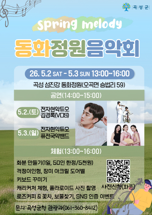 곡성군 관계자는 “봄꽃이 어우러진 동화정원에서 아름다운 음악과 함께 곡성의 매력을 더욱 깊이 느껴보시길 바란다”고 말했다.