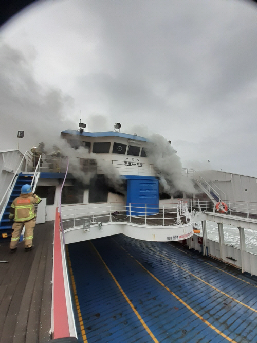 | 10일 오전 7시45분 해남군 송지면 땅끝항 여객선터미널에서 정박 중이던 621t급 여객선 객실에서 불이 나 소방대원이 불을 끄고 있다. 사진제공=전남소방본부 |