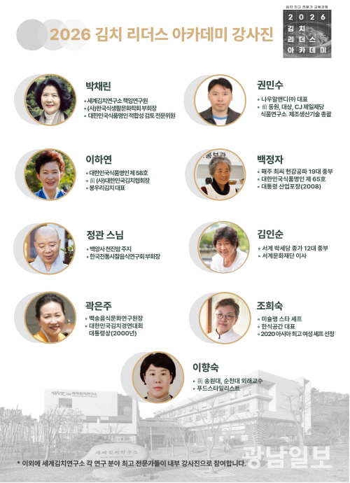 박채린 세계김치연구소 책임연구원은 “김치 리더스 아카데미는 김치 문화의 가치를 계승하고 산업의 지속 가능한 성장을 이끌 전문 인재를 양성하기 위한 프로그램”이라며 “김치를 과학과 산업, 문화의 관점에서 체계적으로 배우고자 하는 분들의 많은 관심과 참여를 바란다”고 말했다.