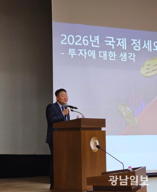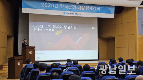 | 13일 한국은행 광주전남본부 1층 강당에서 열린 금융경제 강좌에서 김학균 신영증권 리서치센터장은 ‘2026년 국제 정세와 증권시장’을 주제로 강연했다. |