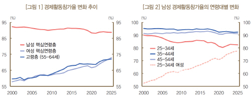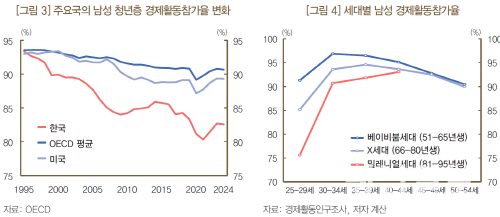 1991∼1995년생 4년제 대학 졸업 이상 학력 남성의 경제활동 참가율은 동일 학력의 1961∼1970년생 남성보다 15.7%p 하락한 반면, 여성의 경우 오히려 10.1%p 상승한 점을 그 근거로 제시했다.