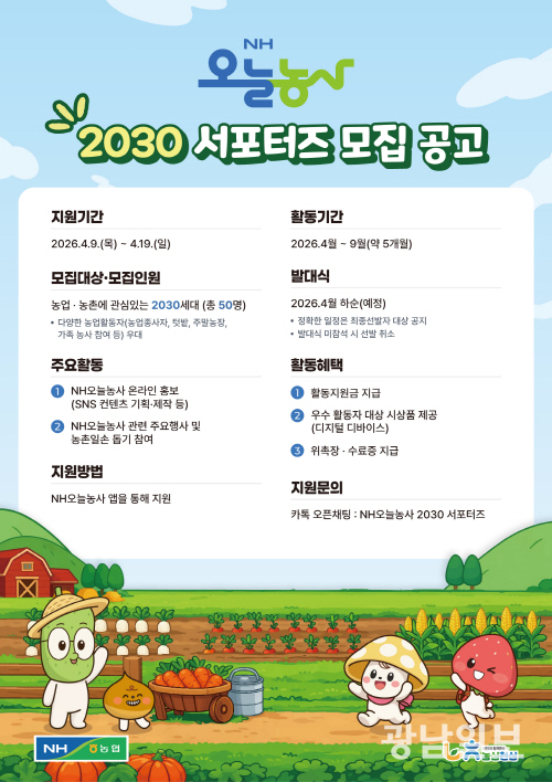 최한호 농협중앙회 디지털전략부장은 “이번 ‘NH오늘농사 2030 서포터즈’가 청년 세대와 함께 농업의 가치를 공유하고 디지털 농업 확산을 이끄는 계기가 되길 바란다”며 “열정과 창의성을 갖춘 청년들의 적극적인 참여를 기대한다”고 말했다.