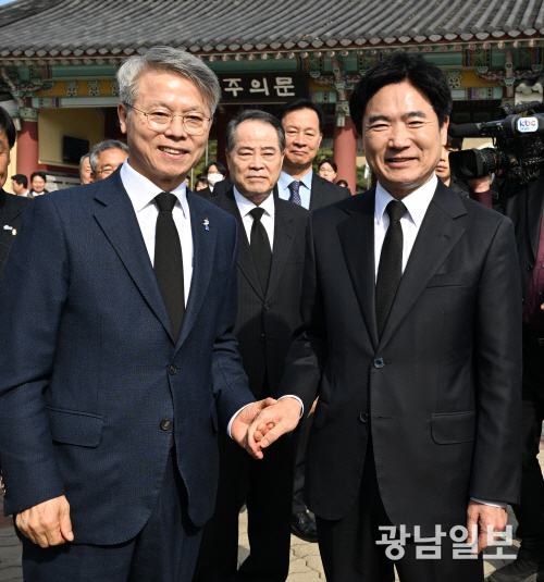 민형배 더불어민주당 전남광주통합특별시장 후보와 김대중 전남광주통합교육감 예비후보가 15일 오전 광주 북구 운정동 국립 5·18민주묘지 민주의문 앞에서 만나 인사하고 있다.최기남 기자 bluesky@gwangnam.co.kr |