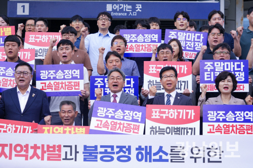 | 지난해 9월 23일 광산구 송정역 광장에서 열린 ‘KTX 호남선 증편 촉구 결의대회’ 모습. |