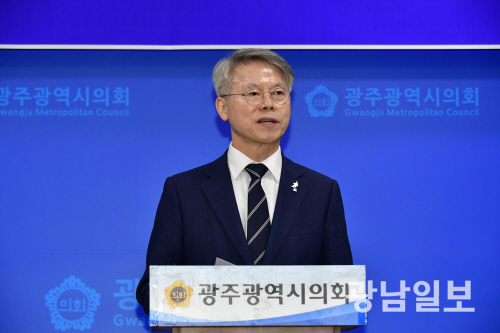| 더불어민주당 민형배 전남광주통합특별시장 후보가 15일 광주시의회에서 기자회견을 갖고 전남광주 대도약을 위한 3대 비전을 제시하고 있다. |