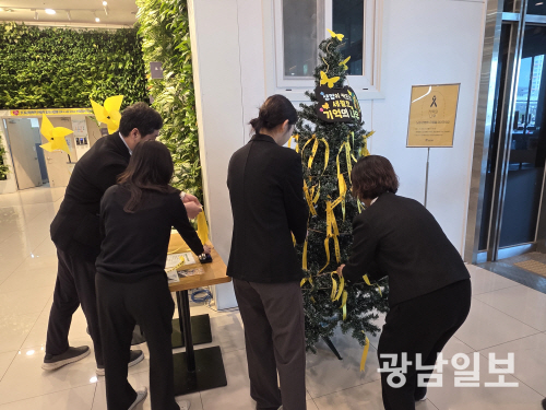 같은 날 광주 남구청 1층 로비에는 ‘생명이 싹트는 세월호 기억의 나무’가 마련됐다. 시민들은 노란 리본에 각자의 기억과 다짐을 적어 나무에 매달며 추모의 뜻을 이어갔다.