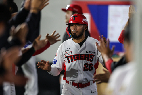 | 16일 광주-기아챔피언스필드에서 열린 2026 신한 SOL KBO리그 키움히어로즈와의 주중 3차전 경기에서 KIA타이거즈 카스트로가 역전 투런포를 폭발시킨 뒤 하이파이브를 하고 있다. 사진제공=KIA타이거즈. |