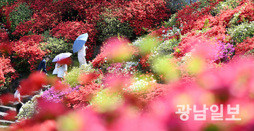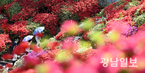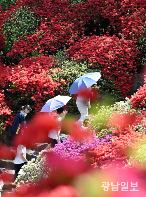 | 휴일을 맞아 19일 오후 광주 북구 동강대 교정을 찾은 시민들이 활짝 핀 철쭉꽃을 바라보며 봄 정취를 만끽하고 있다. 철쭉은 진달래과에 속하는 낙엽관목으로 한국이 원산지이며 걸음을 머뭇거리게 한다는 뜻의 ‘척촉’이 변해서 된 이름이다. 잎에 독이 있어 ‘개꽃’이라고도 한다. 삼국유사의 ‘헌화가’에서 노인이 벼랑 끝의 꽃을 꺾어 수로부인에게 바친 것이 철쭉이라고 전한다.꽃말은 정열과 명예이며 광주광역시 시화(市花)이다. |