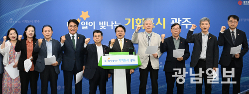 강기정 광주시장과 5·18민주화운동 정신계승위원회 관계자들이 20일 오후 광주시청 브리핑룸에서 공동 기자회견을 열고 5·18민주화운동 정신의 헌법 전문 수록을 제22대 국회에 공식 촉구하고 있다.