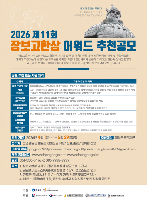 | 제11회 장보고 한상 어워드 공모전 안내 포스터. 사진제공=완도군 |