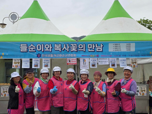 | 2026 화순 봄꽃 축제 현장에서 ‘들순이 국화빵’과 ‘복사꽃빵’을 홍보·판매 중인 한국생활개선화순군연합회 회원들 모습. 사진제공=화순군 |