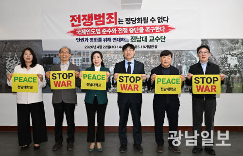 | “전쟁 범죄 중단 하라” 전남대학교 교수회와 민주평등사회를 위한 전국 교수연구자협의회 전남대분회 교수 170여명은 22일 오후 용봉관 5·18 기념관에서‘전쟁 범죄 중단과 국제인도법 준수를 촉구하는 전남대학교 교수 성명’을 발표하고 있다. 이번 성명은 최근 중동 지역에서 발생하고 있는 민간인 학살과 인도적 위기에 대해 국제사회가 책임 있게 대응해야 한다는 문제의식에서 마련되었으며 교수들은 민간인에 대한 폭력은 어떠한 경우에도 정당화될 수 없다는 입장을 밝혔다.최기남 기자 bluesky@gwangnam.co.kr |