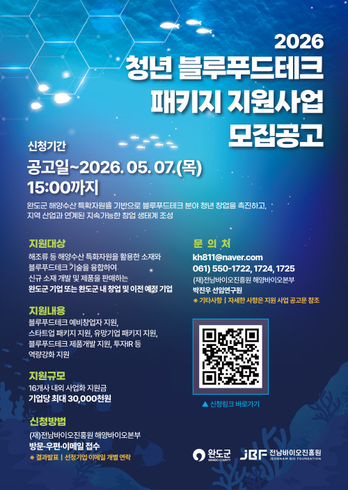 5월 7일까지 완도읍 농공단지에 위치한 해양바이오본부로 방문·우편 신청을 하고, 기타 자세한 사항은 전남바이오진흥원과 완도군 누리집을 통해 확인할 수 있다.