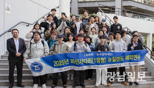| 2025년 파란사다리사업에 참여한 학생들이 뉴질랜드 오클랜드대학교 캠퍼스 투어를 마친 뒤 기념촬영을 하고 있다. 사진제공=동신대학교 |