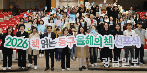 | 동구, ‘2026 올해의 책’ 선포 ‘AI 시대, 사람답게 선택하는 삶’을 주제로 23일 오후 광주 동구청 대회의실에서 열린 ‘2026 책 읽는 동구, 올해의 책 선포식’에 참석한 신동하 부구청장과 어린이등 주민들과 기념촬영을 하고 있다. 최기남 기자 bluesky@gwangnam.co.kr |