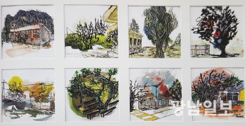 개관전은 ‘남평으로의’ 타이틀로 지난 3월 19일부터 이달 18일까지 성황리에 열렸다. 당시 전시에는 김해성, 조근호 류재웅 한희원 박구환 작가 등이 참여했다. ‘남평으로의’ 다음은 여백이다. 자신이 성심껏 마련한 문화공간을 찾는 사람들이 채워달라는, 혹은 채워가라는 의미인듯 싶다. 전시 첫 시험을 끝낸 정 작가는 개관 두번째 전시를 마련했다. 전시는 지난 19일 개막, 오는 5월 31일까지 ‘다시 피어난 학교, 507일간의 스케치’라는 주제로 진행 중이다. 이번 전시는 주로 어반스케치 작품이 출품된 가운데 문화공간 탄생 과정을 예술적 기록으로 담아낸 첫번째 기획전으로 이해하면 된다.