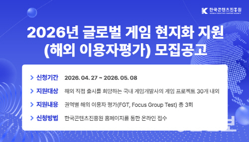 이번 사업은 온라인 해외 이용자평가 시 회차별 최소 100명 이상의 현지 이용자가 참여하는 평가를 포함해 총 3회의 해외 이용자 평가(Focus Group Test, 이하 FGT)를 지원한다. 이를 통해 30개 내외 게임 프로젝트가 글로벌 출시 전 현지 적합성을 점검할 수 있도록 돕는다.