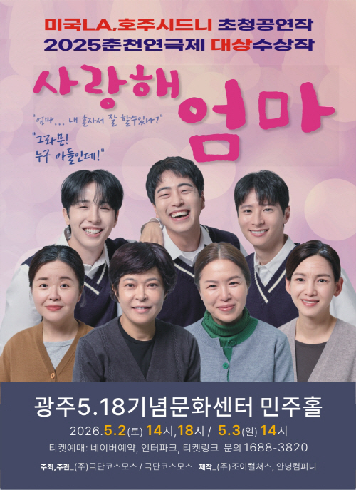 한편, 극단 코스모스가 주최·주관하고 ㈜조이컬쳐스·안녕컴퍼니 제작하는 연극 ‘사랑해 엄마’는 오는 5월 2일 오후 2시·6시, 3일 오후 2시 광주 5·18기념문화센터 민주홀에서 열린다. 예매는 네이버예약과 인터파크, 티켓링크를 통해 가능하다. 입장료는 R석 6만6000원, S석 5만6000원.