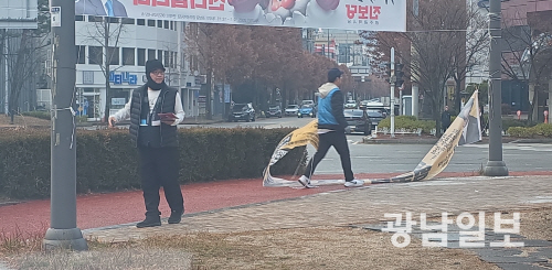 | 광주 북구가 광주역 사거리 일원에서 불법 선거 현수막을 수거하고 있는 모습. 사진 제공=광주 북구청 |