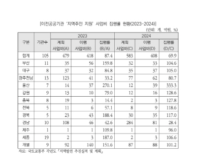 반면 지난 2023년 울산은 계획 이행 목표를 초과해 집행률이 270.1%, 세종은 187.0%, 경북은 188.4%나 됐고, 지난 2024년 울산은 333.3%, 강원은 128.6%, 충북은 127.8%인 것으로 나타나 크게 대조된다.